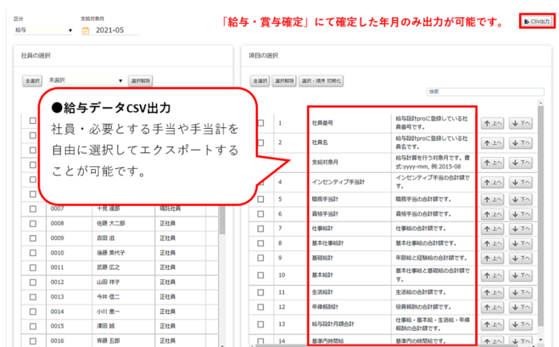 給与・賞与データのCSV出力は、給与・賞与の評価で確定の作業を行わないと出力できません。