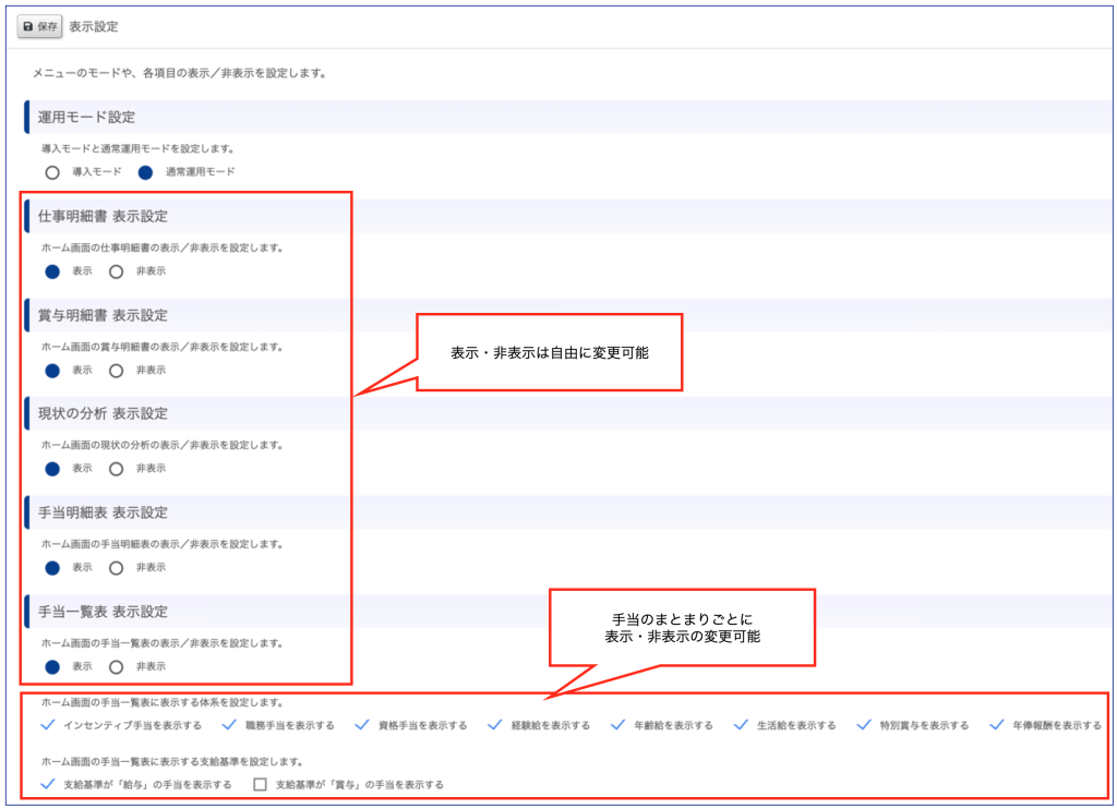見せたい手当の項目だけ表示設定をしてください。各社員が自分のパソコンや