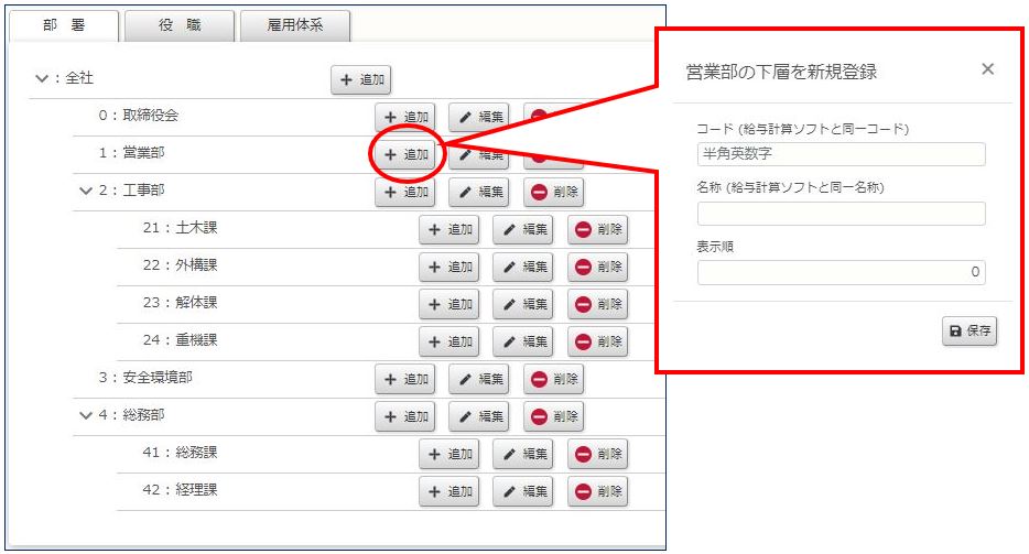 部署の登録は、コード・名称・表示順を入力したら保存ボタンを押して確定します。
