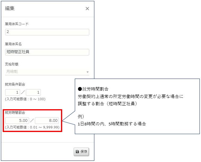 就労時間割合の部分に時間の割合を入力します。例示ですと1日8時間労働のうち5時間働く