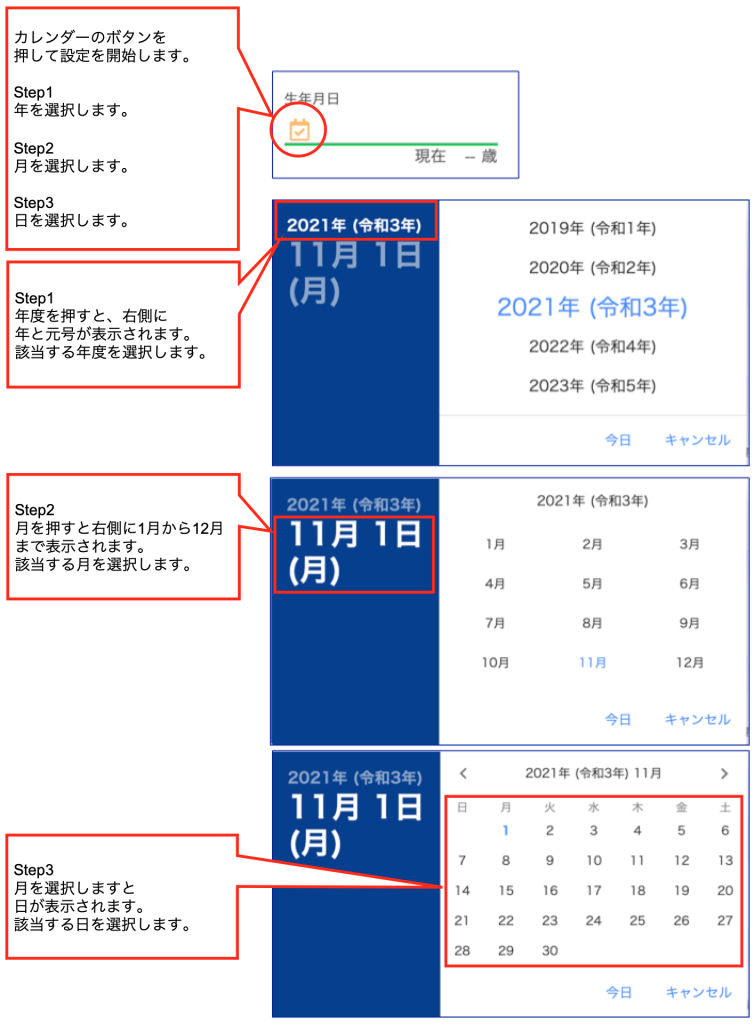 新規に1名追加する場合など入社年月日や生年月日を入力する際にカレンダー機能を使用します。
