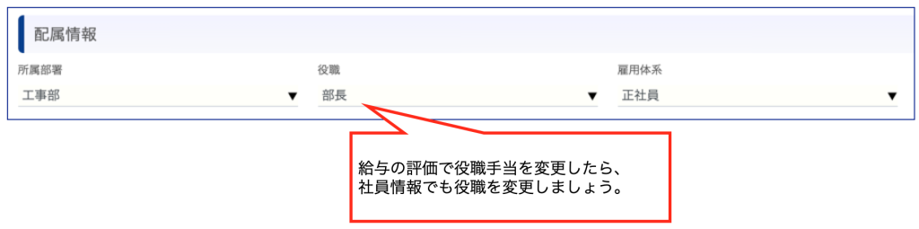 役職が変更された場合は、「給与の評価」で手当の変更だけではなく、社員情報の役職も必ず変更してください。