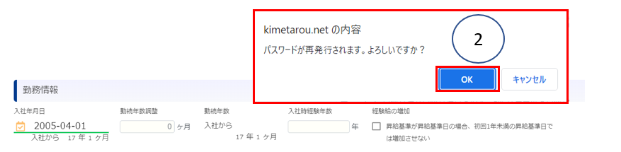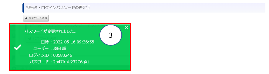 忘れた社員の社員情報画面を開いたら、一番下に「担当者・ログインパスワードの再発行」